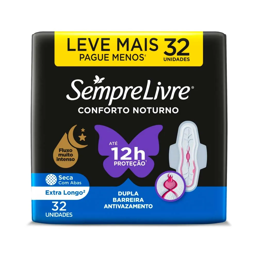 Sempre Livre Conforto Noturno é um absorvente higiênico que garante até 10 horas de proteção contra vazamentos, sendo ideal para fluxos intensos devido à sua capacidade de absorção e gel superabsorvente. Sua forma anatômica exclusiva se adapta às curvas do corpo para proporcionar maior conforto. Conta com a tecnologia TRI PROTECT, oferecendo absorção imediata, canais que distribuem o fluxo e uma dupla barreira antivazamento. É suave, fabricado com 70% de materiais de origem natural e sem corantes. Além disso, foi ginecologicamente testado, mantendo o pH natural da sua zona íntima.