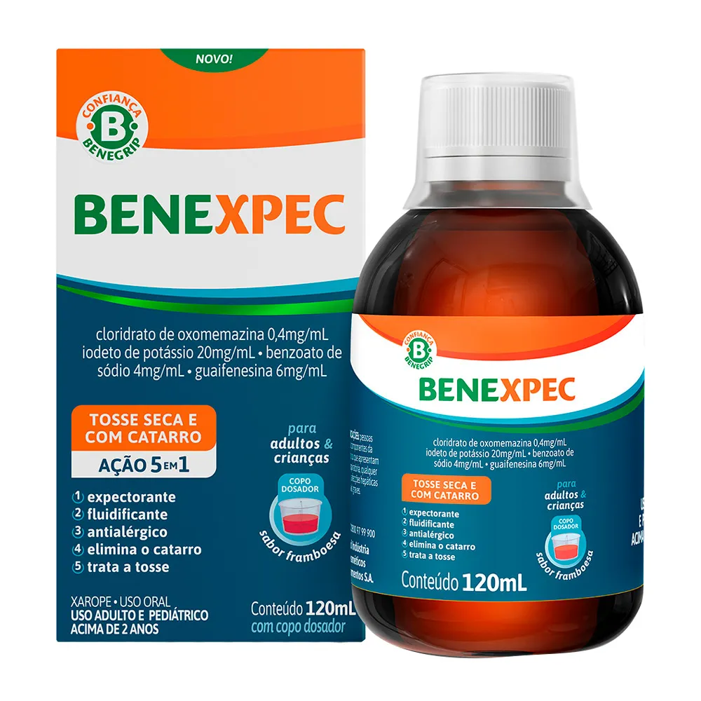 | Indicação | Benexpec é um medicamento indicado para o alívio da tosse com catarro, seca ou alérgica, que possui ação expectorante, fluidificante e antialérgica, ajudando a eliminar o catarro e tratar a tosse. Sua formulação é composta pela associação da oxomemazina, iodeto de potássio, benzoato de sódio e guaifenesina. Tem sabor framboesa e pode ser usado por adultos e crianças a partir de 2 anos. |