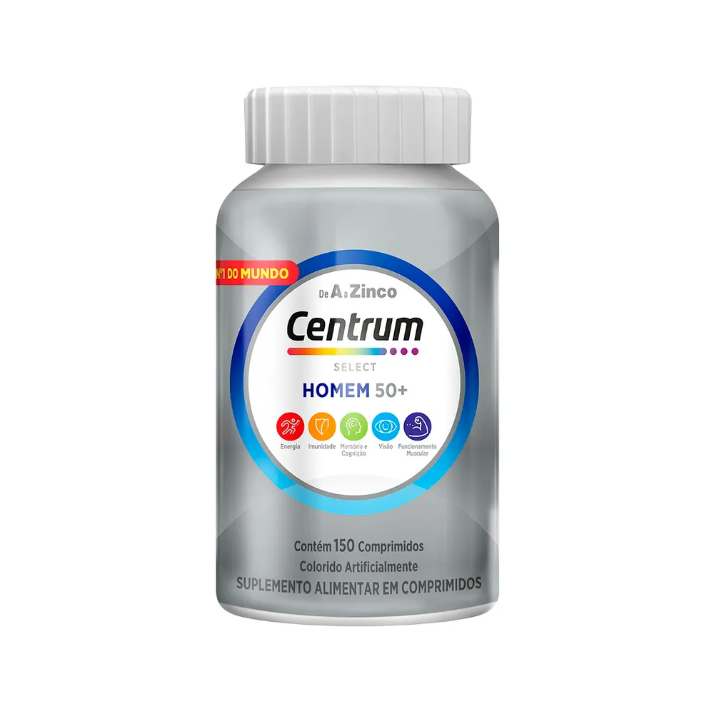 O Centrum Select Para Homem é um suplemento Vitamínico-Mineral de A a Zinco com com Vitaminas do Complexo B, Vitaminas C, D3 e E, Cálcio, Magnésio, Selênio e Manganês. Foi desenvolvido especialmente para homem acima dos 50 anos e contribui para o fortalecimento dos músculos e o sistema imunológico, além de auxiliar na saúde da pele e no aproveitamento da energia dos alimentos. Tomar uma vitamina todos os dias pode ajudar a fornecer os nutrientes que ajudam a manter um corpo saudável. O Zinco presente na composição apoia a função cerebral e as vitaminas A, C e E ajudam a manter a visão saudável. Este suplemento vitamínico possui uma fórmula balanceada que complementa a alimentação diária, fornecendo os nutrientes essenciais para o bom funcionamento do organismo masculino e protegendo as células contra a ação dos radicais livres. Não contém glúten, calorias e açúcar. Seu consumo deve estar associado a uma alimentação equilibrada e hábitos de vida saudáveis.