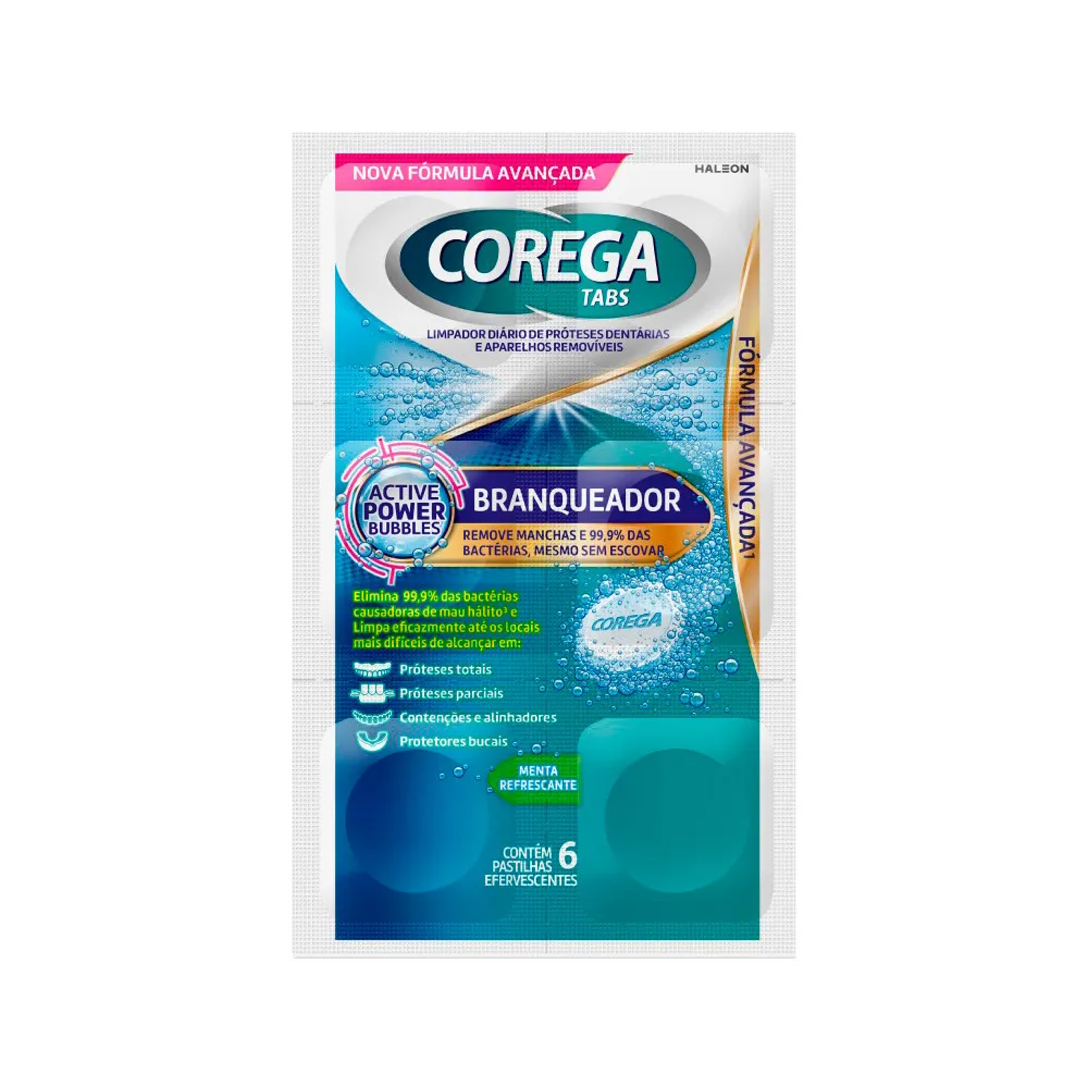 Para aqueles que procuram uma limpeza profunda em aparelhos removíveis, aparelhos ortodônticos, dentaduras, protetores bucais e próteses dentárias, Corega Tabs é a solução perfeita. Em apenas 15 minutos, Corega age na limpeza profunda, eliminando 99,9% das bactérias causadoras do mau hálito. Além disso, a fórmula não abrasiva garante uma limpeza eficaz sem danificar o seu aparelho bucal. Corega Tabs Branqueador também age nas manchas, promovendo uma limpeza profunda e removendo até as manchas mais difíceis. Para utilizar Corega, basta colocar uma pastilha em um copo com água morna, submergir o aparelho ou próteses na solução e deixá-lo de molho por 15 minutos. Em seguida, escove o aparelho com a própria solução de Corega Tabs, enxágue bem em água corrente e descarte a solução. Para uma saúde bucal ainda mais completa, é recomendado utilizar um creme dental e escova adequados.