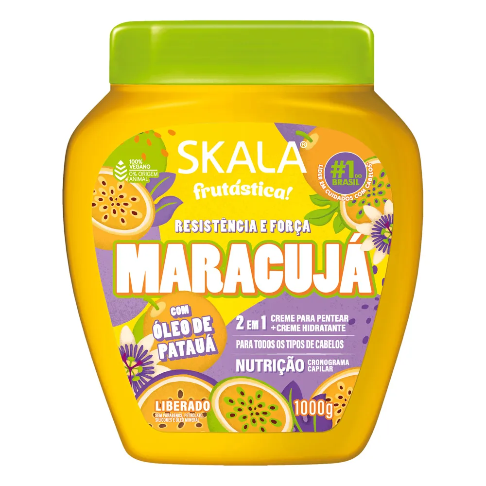Acelere o crescimento e recupere a vida dos seus cabelos com o Creme 2 em 1 Skala Frutástica Maracujá e Óleo de Patauá. Este potão de 1kg une a praticidade com o poder da natureza brasileira para oferecer um tratamento completo de Nutrição e reconstrução da fibra capilar.