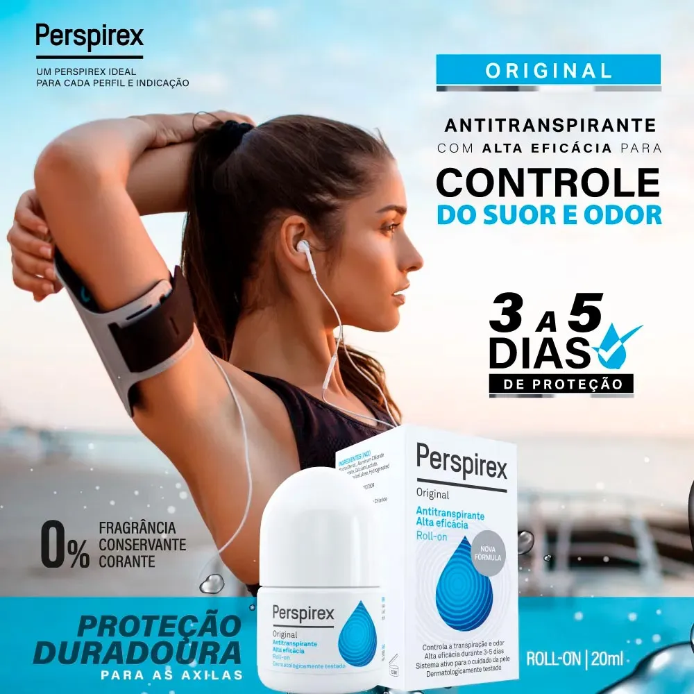 O Perspirex Roll-on é um antitranspirante de alta performance, indicado para quem busca um controle eficaz do suor excessivo (hiperidrose) e do mau odor (bromidrose).