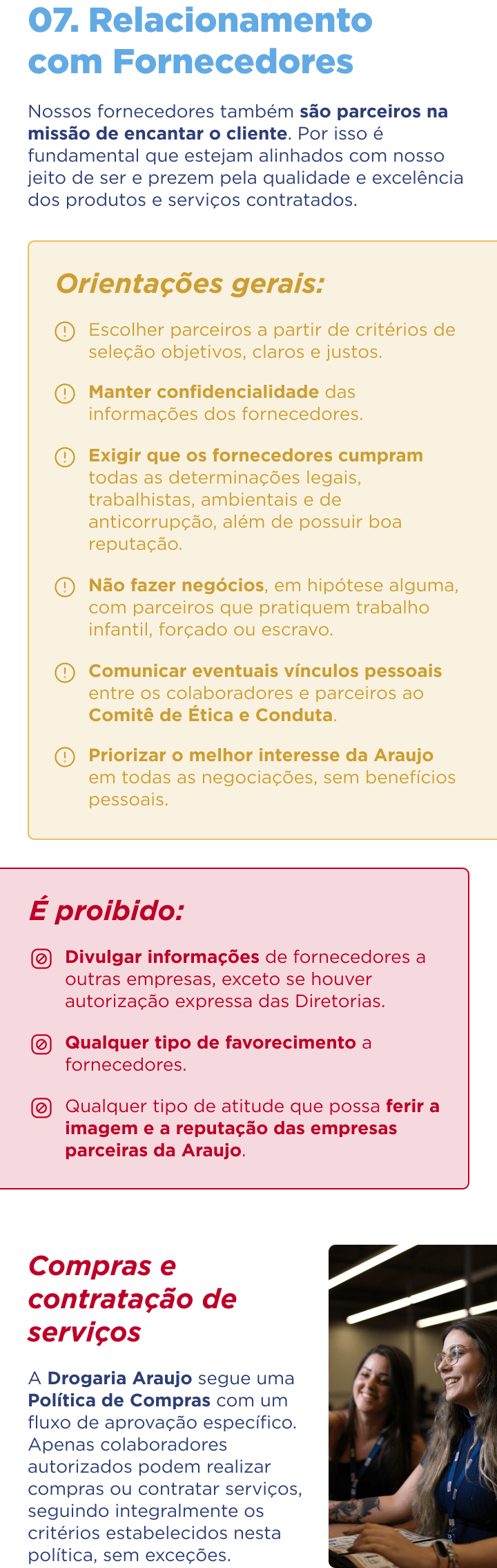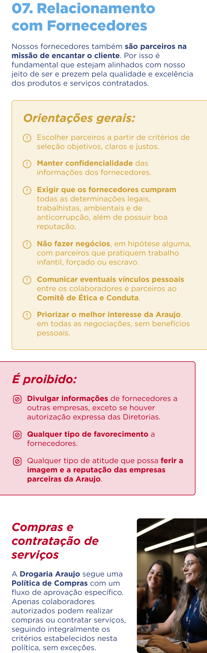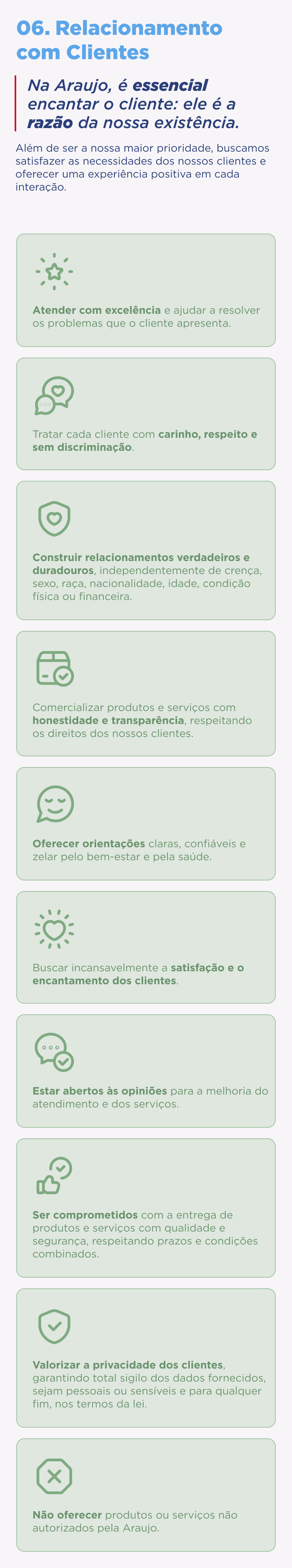 Este Código de Ética e Conduta é um dos principais documentos do Programa de Integridade da Araujo. Ele é profundamente alinhado à nossa cultura e, afinal, todos somos responsáveis pelas relações no nosso dia a dia – com colegas, superiores, subordinados, fornecedores, parceiros, instituições, empresas, comunidade e, claro, clientes.