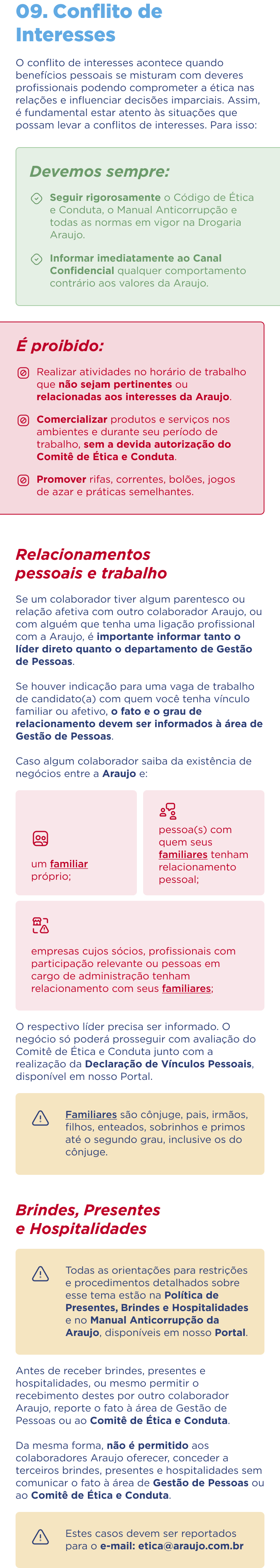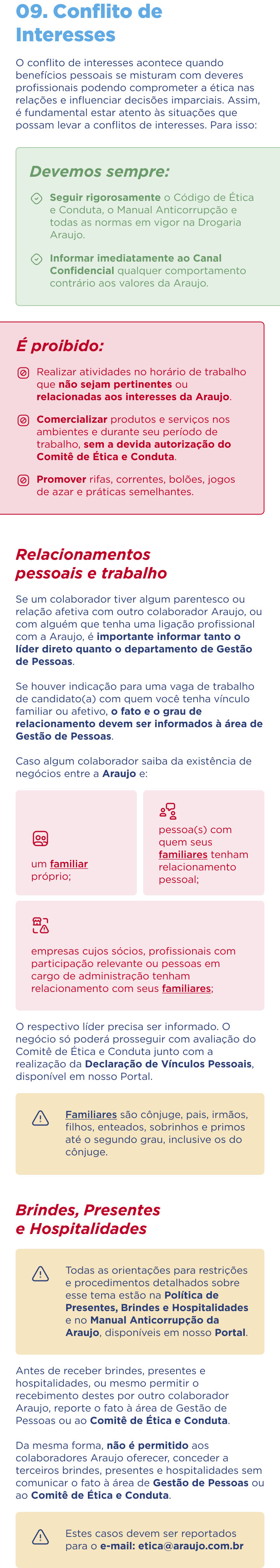 Este Código de Ética e Conduta se aplica, sem exceção, a todos os colaboradores, acionistas, parceiros e pessoas que mantenham relacionamento com a Araujo.