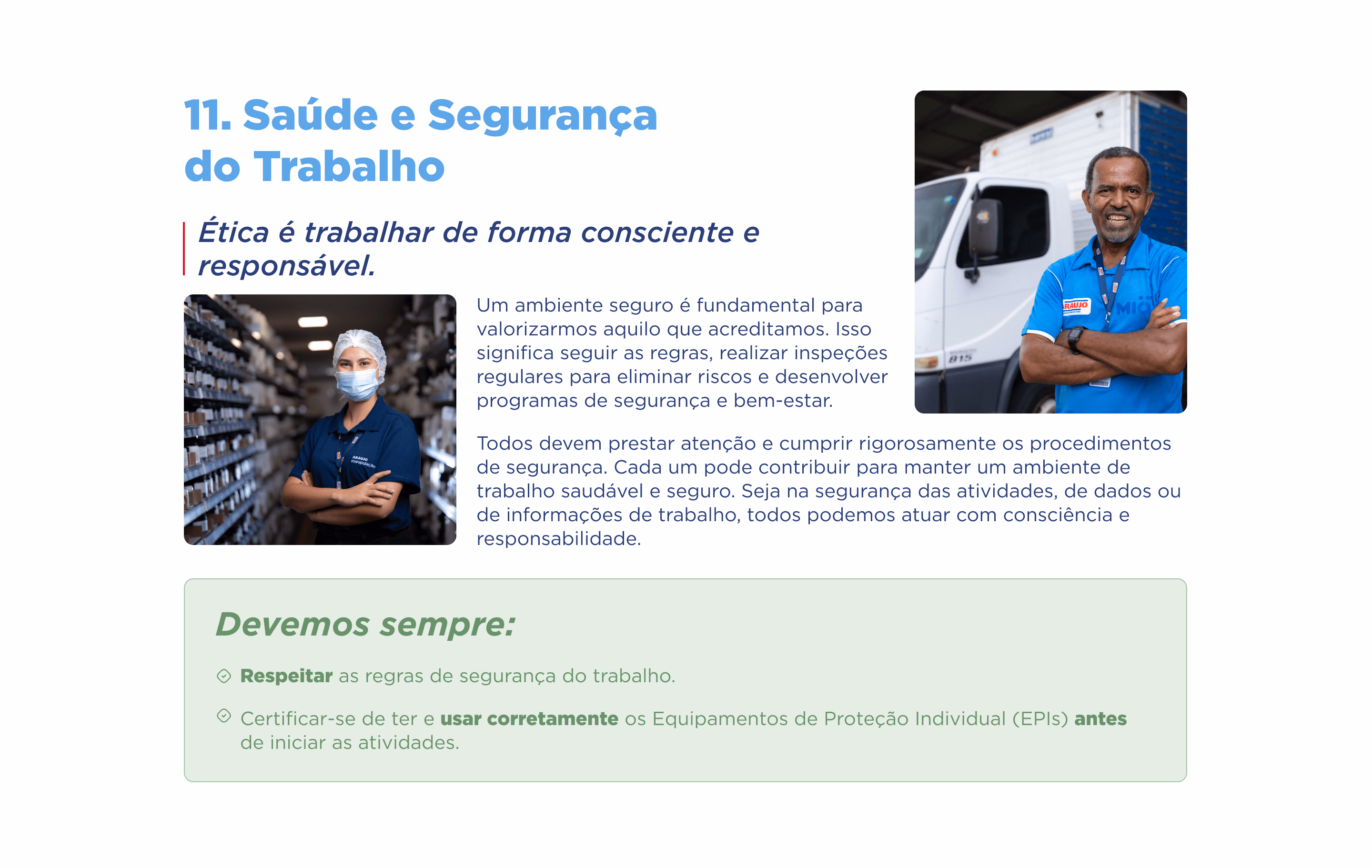 Mais do que conhecer, convidamos você a abraçar e vivenciar o Código de Ética e Conduta – para multiplicar essa atitude positiva, nobre e tão bonita, que tem tudo a ver com aquilo em que acreditamos: cuidar e fazer o bem, com seriedade, confiança, convicção e amor. Fazer o certo, do jeito certo, sempre.