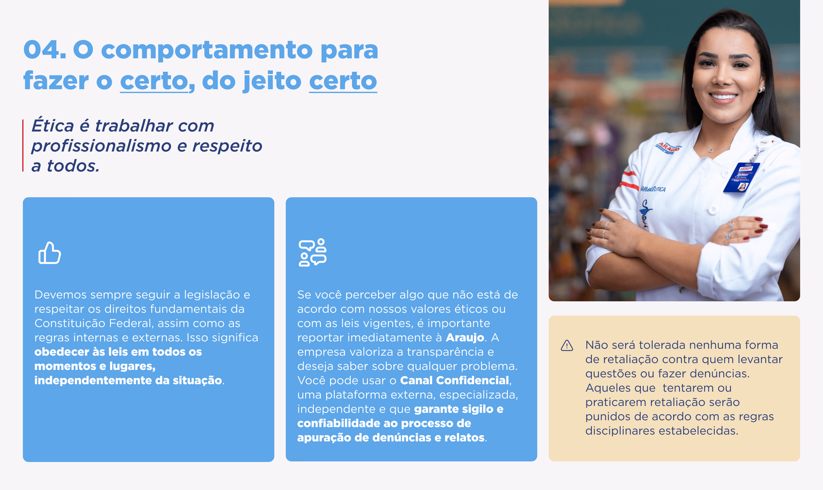 Se você perceber algo que não está de acordo com nossos valores éticos ou com as leis vigentes, é importante reportar imediatamente à Araujo. A empresa valoriza a transparência e deseja saber sobre qualquer problema. Você pode usar o Canal Confidencial, uma plataforma externa, especializada, independente e que garante sigilo e confiabilidade ao processo de apuração de denúncias e relatos.
