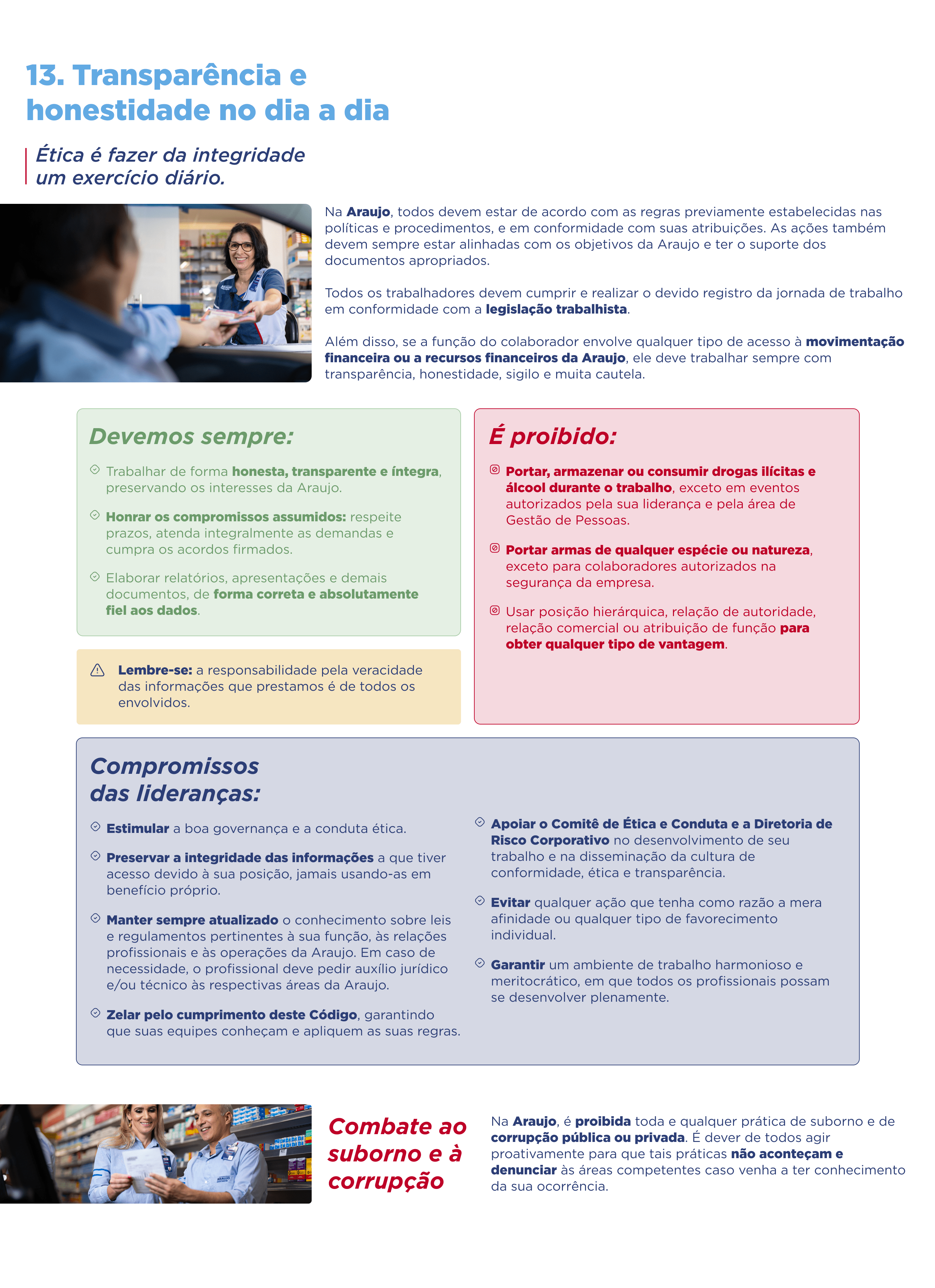 O Código de Ética e Conduta entra em vigor assim que é aprovado e divulgado pela Presidência da empresa, e é parte integrante de todos os contratos assinados pela Araujo.