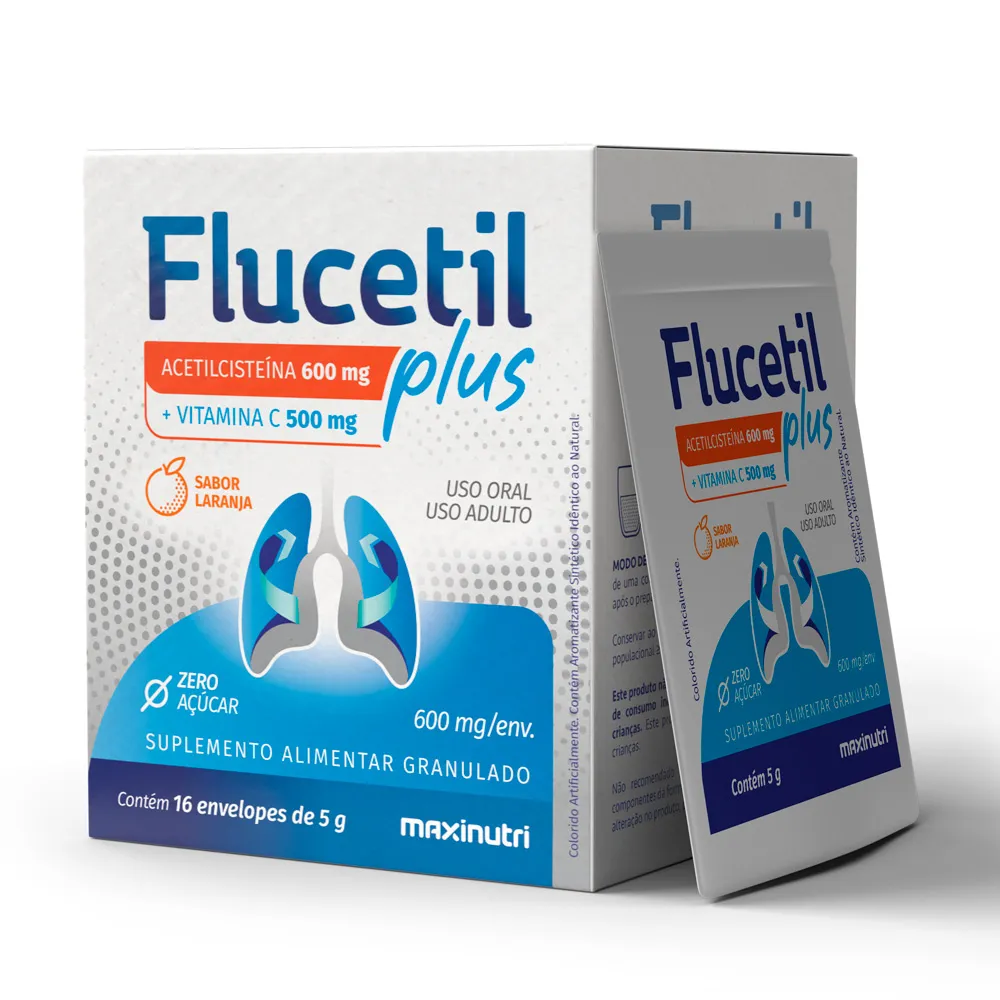 Flucetil Plus Granulado Maxinutri - 600mg Acetilcisteína + 500mg Vitamina C - Sabor Laranja, Zero Açúcar, 16 Envelopes