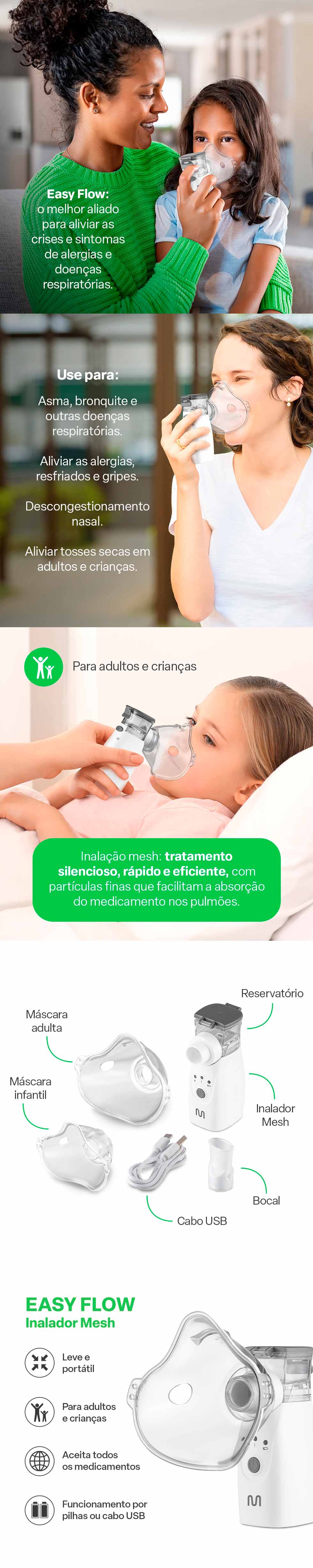Seu design compacto, leve e inteligente foi pensado para a mobilidade da vida moderna. Você pode usá-lo com pilhas ou conectado via cabo USB, tornando-o o companheiro perfeito para usar dentro e fora de casa, no trabalho ou em viagens. Além disso, ele é ultrassilencioso, o que é ideal para realizar a inalação em bebês e crianças enquanto dormem, sem causar sustos, choro ou desconfortos. O aparelho possui aceitação universal, podendo ser utilizado com qualquer tipo de soro fisiológico ou medicamento inalatório prescrito pelo seu médico (inclusive corticoides). Para completar, conta com um sistema de desligamento automático após 20 minutos, garantindo segurança e economia.