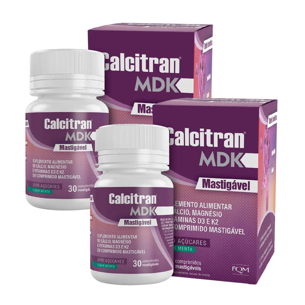 Calcitran® MDK Mastigável é um suplemento de Cálcio com Magnésio e Vitamina D3 e K2 em comprimidos mastigáveis sabor menta, com duplo benefício: auxilia na manutenção da saúde óssea e no funcionamento muscular.