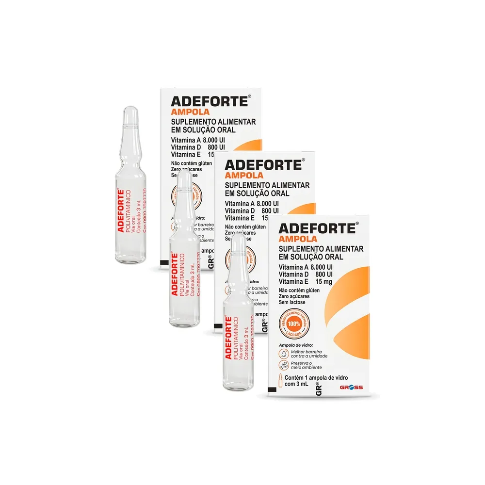 O Adeforte é um suplemento vitamínico oral com vitaminas A, D e E (vitaminas lipossolúveis). Ele é indicado para auxiliar na reposição dessas vitaminas quando existe deficiência ou necessidade aumentada, sempre com uso orientado por profissional de saúde. A apresentação em flaconete de 3ml facilita a administração e ajuda a manter a dose organizada no dia a dia.