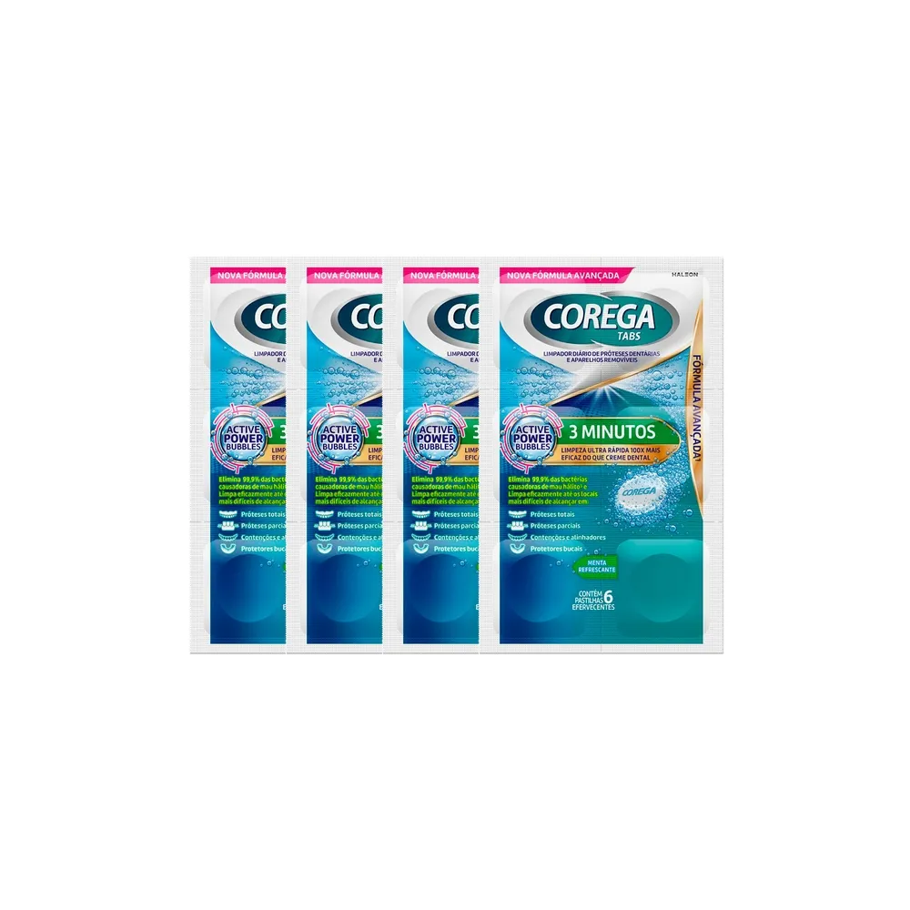 Corega Tabs 3 Minutos deixa sua dentadura ou aparelhos removíveis mais limpo, brilhante e refrescante** em apenas 3 minutos¹, matando até 99,9% das bactérias causadoras de mau hálito², além de ajudar a remover manchas difíceis e reduzir a placa promovendo a devida higienização de sua prótese, matando 10x mais germes do que um creme dental regular³.