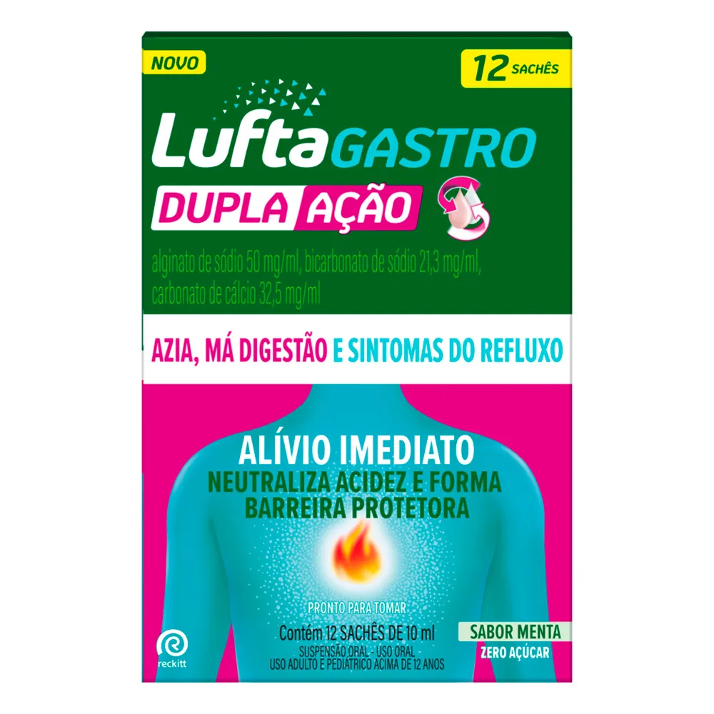 | Indicação | Luftagastro Dupla Ação é indicado para tratar os sintomas de excesso de acidez gástrica (hiperacidez) e sintomas do refluxo gastroesofágico, como regurgitação ácida, queimação (azia) e dispepsia (má digestão). Tais sintomas podem ocorrer, por exemplo, após as refeições, antes de dormir ou durante a gravidez. |