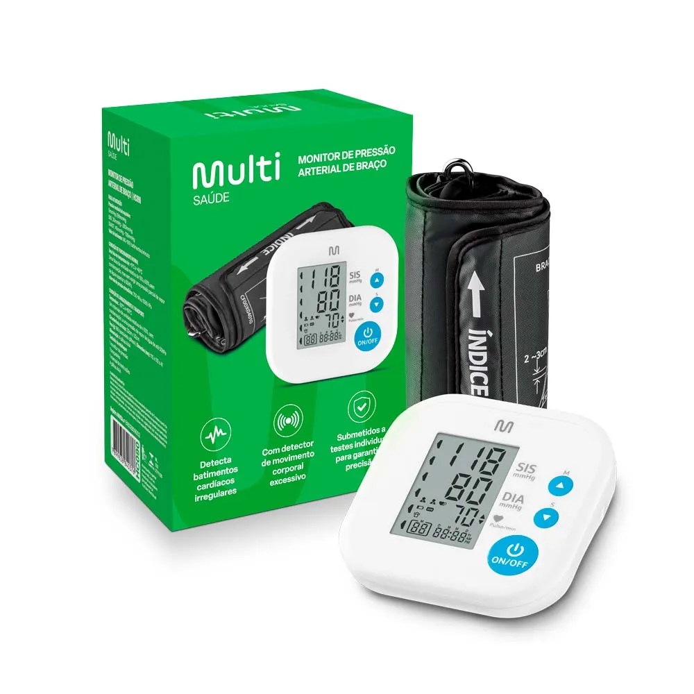 Monitor de Pressão Arterial Digital de Braço Multi Saúde - HC090Conheça o Monitor de Pressão Arterial Digital de Braço da linha Multi Saúde e tenha segurança e precisão ao medir sua pressão!Display grande que facilita a leitura das informaçõesIndicador gráfico de nível de hipertensãoDetecta batimentos cardíacos irregularesRealiza a média das 3 últimas leiturasFunciona com 4 pilhas AAACircunferência do braço: 22 à 32cmCor: Branco