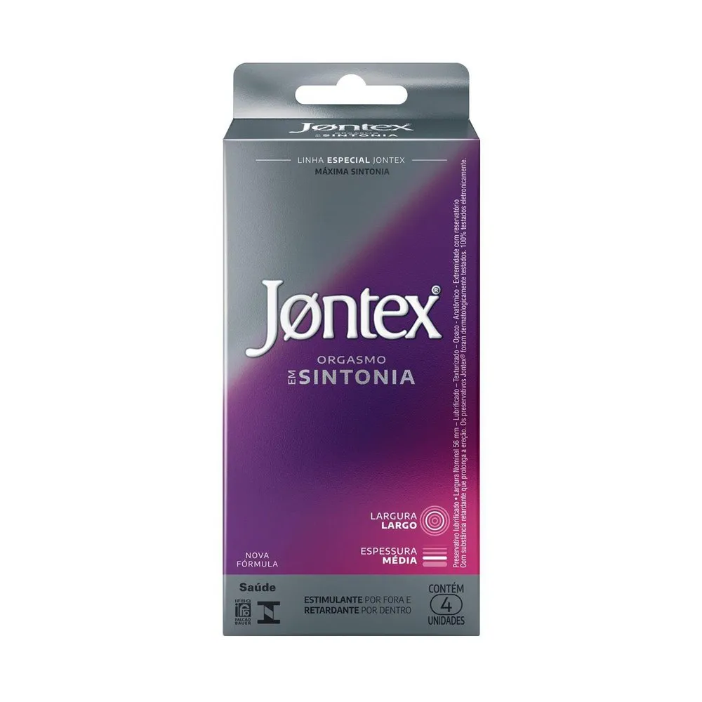 PRESERVATIVO JONTEX ORGASMO EM SINTONIA 4 UNIDADESO Preservativo Jontex Orgasmo em Sintonia foi especialmente formulado para proporcionar uma experiência intensa para ambos, ajudando a atingir o clímax mútuo com lubrificante especial para retardar o orgasmo do homem e texturas para intensificar o prazer da mulher. Enquanto age como estimulante para ela, age como retardante para ele. Sinta orgasmo em sintonia.Lubrificante com 5% de benzocaína, um anestésico local que auxilia na ereção na ereção prolongada dele. Textura desenvolvida para estimular o orgasmo dela. Formato anatômico para conforto e prazer. Largura nominal: 56mm.O que é: Preservativo Jontex Orgasmo em sintonia foi especialmente formulado para ela e para ele. Enquanto age como estimulante para ela, age como retardante para ele. É testado um a um eletronicamente, proporcionando segurança e confiança.Para que serve: Além de agir como contraceptivo, também é um método muito importante e eficiente na prevenção à doenças sexualmente transmissíveis.