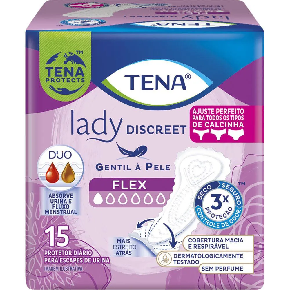 Protetor Diário TENA Lady Discreet Flex é um protetor de calcinha, específico para mulheres com incontinência urinária leve. É ideal para gotejamentos e pequenos escapes de urina (espirros, risadas, ou algum escape com exercícios físicos). Indicado para usuárias ativas com mobilidade.