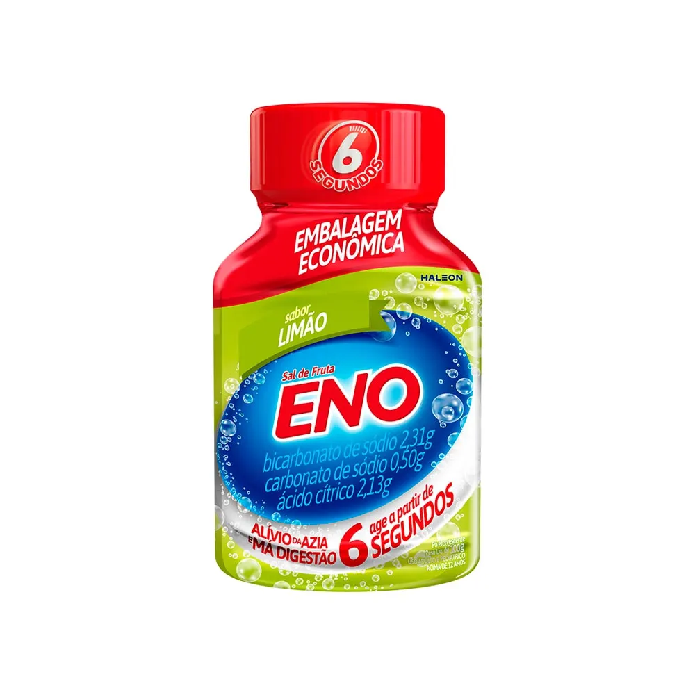 SAL DE FRUTA ENO LIMÃO ANTIÁCIDO PARA AZIA E MÁ DIGESTÃO FRASCOEno Sal de Fruta Limão é um antiácido indicado azia, má digestão e outros transtornos estomacais, tais como excesso de acidez do estômago e indigestão ácida. Os componentes do Sal de Frutas Eno Limão, quando dissolvidos em água, reagem entre si, produzindo um sal de efeito antiácido, capaz de iniciar a redução da acidez do estômago em 6 segundos.Por que Eno limão?ENO alivia em 6 segundos a azia ou má digestão.Sabor:Sabor ENO Limão.Modo de uso:Para consumir ENO Limão deve-se dissolver 5g (conteúdo de 1 colher de chá) em um copo pequeno de água (200 ml) e beba. Recomenda-se consumir o sal de fruta ENO Limão assim que ele tiver se dissolvido completamente na água.Conheça toda a família Eno:Sal de Fruta Eno está disponível em 2 tamanhos; frasco com 20 doses, e um sachet com 2 doses. Conheça também os outros sabores de ENO, Tutti Frutti, Original, Laranja, Abacaxi, Guaraná e Limão.