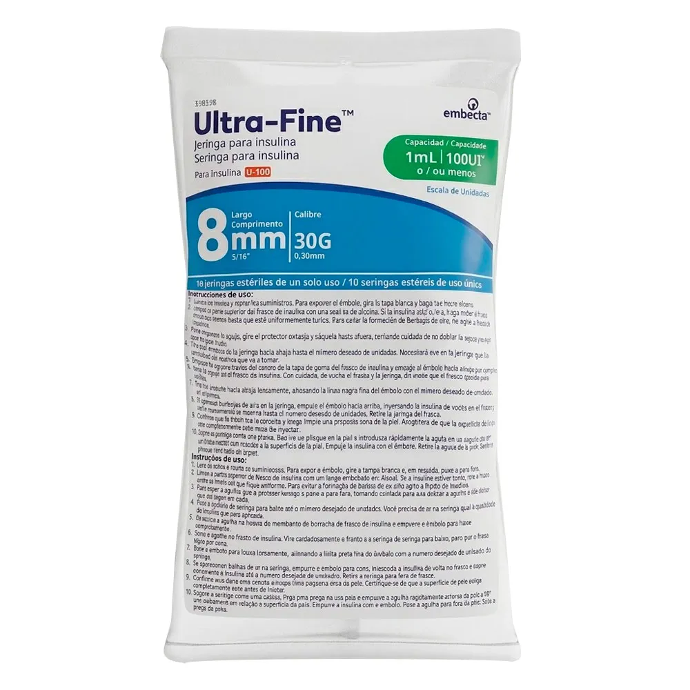 A Seringa para Insulina Ultra-Fine da Embecta (anteriormente BD) é referência mundial em qualidade e segurança para o tratamento do diabetes. Desenvolvida para oferecer uma aplicação mais suave e precisa, esta seringa possui capacidade de 1mL, ideal para doses de até 100 unidades de insulina U-100.