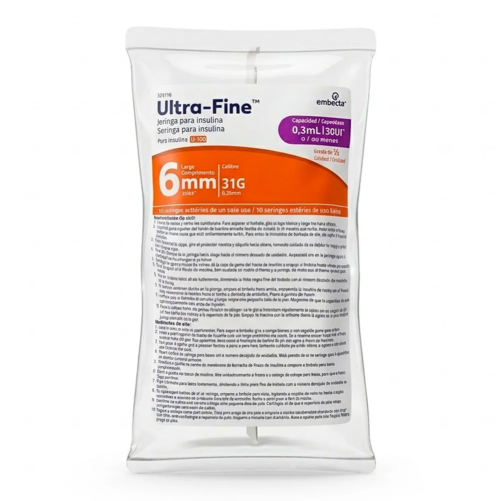 Seringa para Insulina Ultra-Fine Embecta 0,3mL 30UI 6mm 31G – Pack com 10 Seringas Estéreis com Escala de MEIA Unidade (1/2)