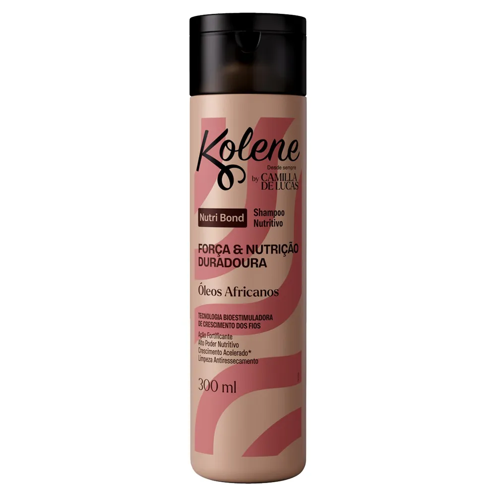 A Linha Kolene Nutri Bond une o poder dos Óleos de Baobá, Moringa, Nigella, Tamanú, Opuntia, Karité e Coco com uma Exclusiva Tecnologia Bioestimuladora de crescimento dos fios, que juntamente com os demais ingredientes da fórmula, aumenta o brilho, promove uma nutrição intensa e duradoura, acelera o crescimento dos fios1 e confere força, evitando diminuindo a queda. O que é? Shampoo Nutritivo. O que tem? Óleos Africanos e Tecnologia Bioestimuladora de crescimento dos fios. O que faz? Limpa do couro cabeludo às pontas sem ressecar, fortalecendo e estimulando o crescimento dos fios, proporcionando nutrição profunda e duradoura, com o uso da linha completa.